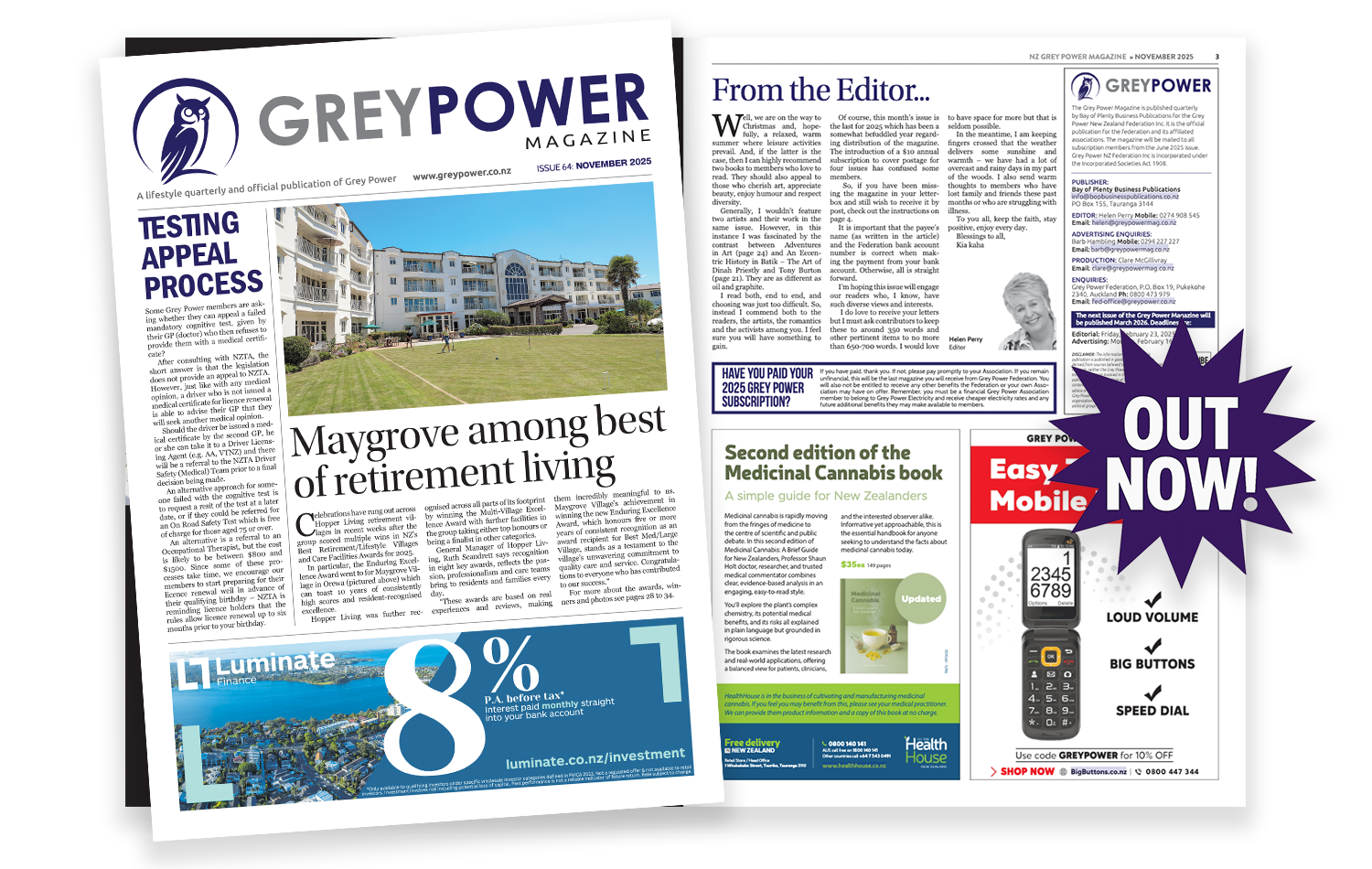 The Grey Power Magazine is published quarterly by Bay of Plenty Business Publications for the Grey Power New Zealand Federation Inc. It is the official publication for the federation and its affiliated associations. Grey Power Magazine is either posted or the digital links is emailed to all financial members of Grey Power. Grey Power NZ Federation Inc is incorporated under the Incorporated Societies Act 2022